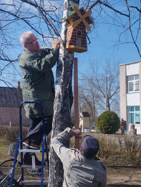 Учащиеся вместе с родителями изготовили домики для птиц и разместили в школьном дворе.